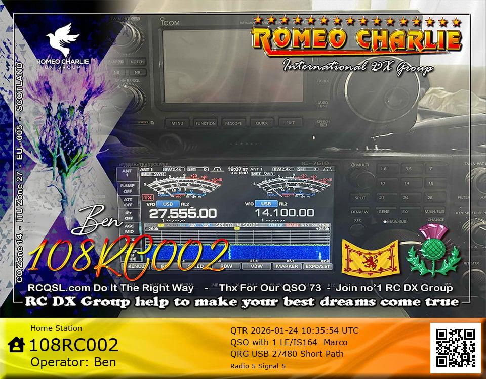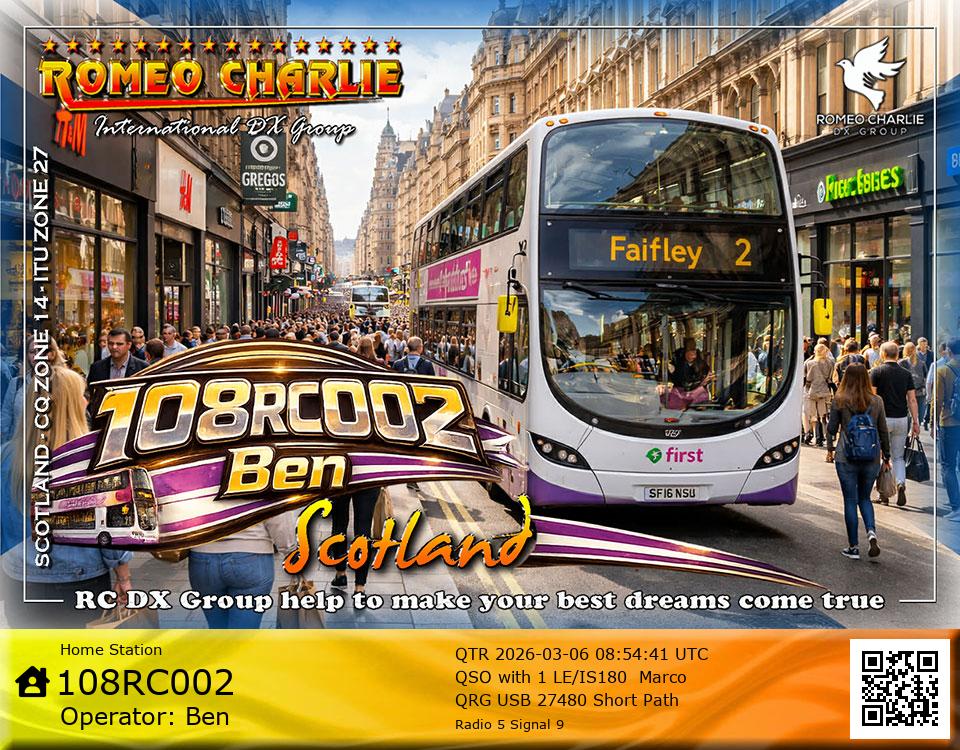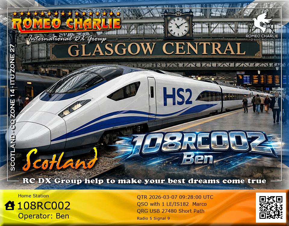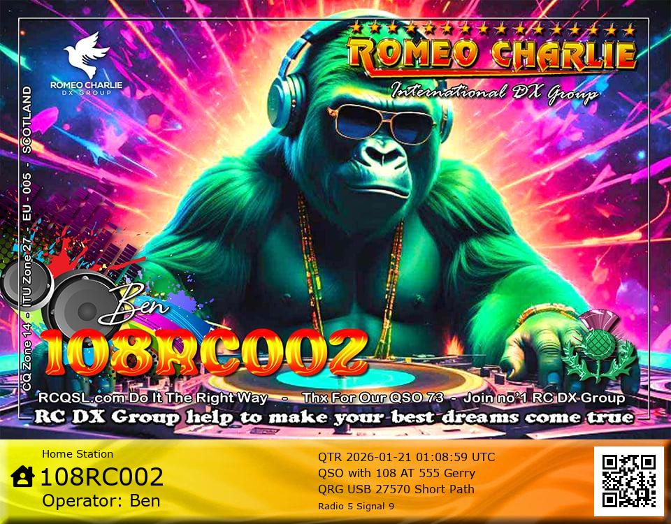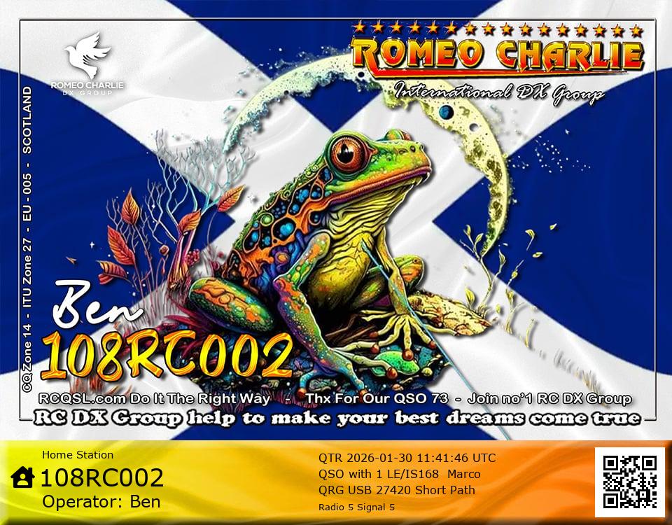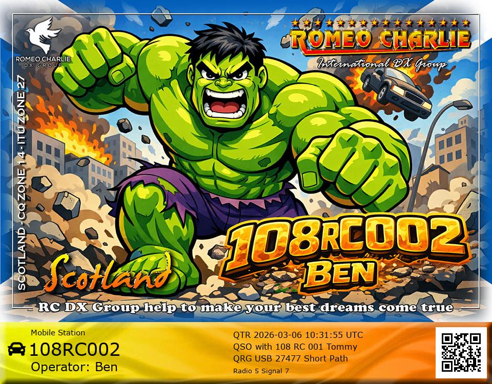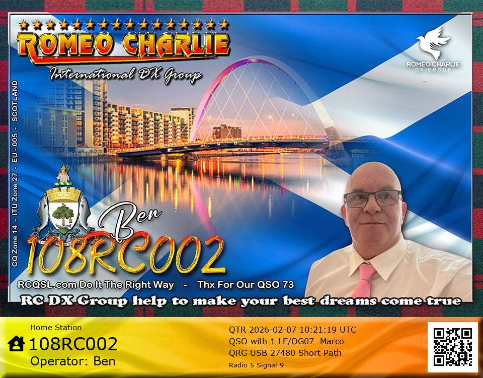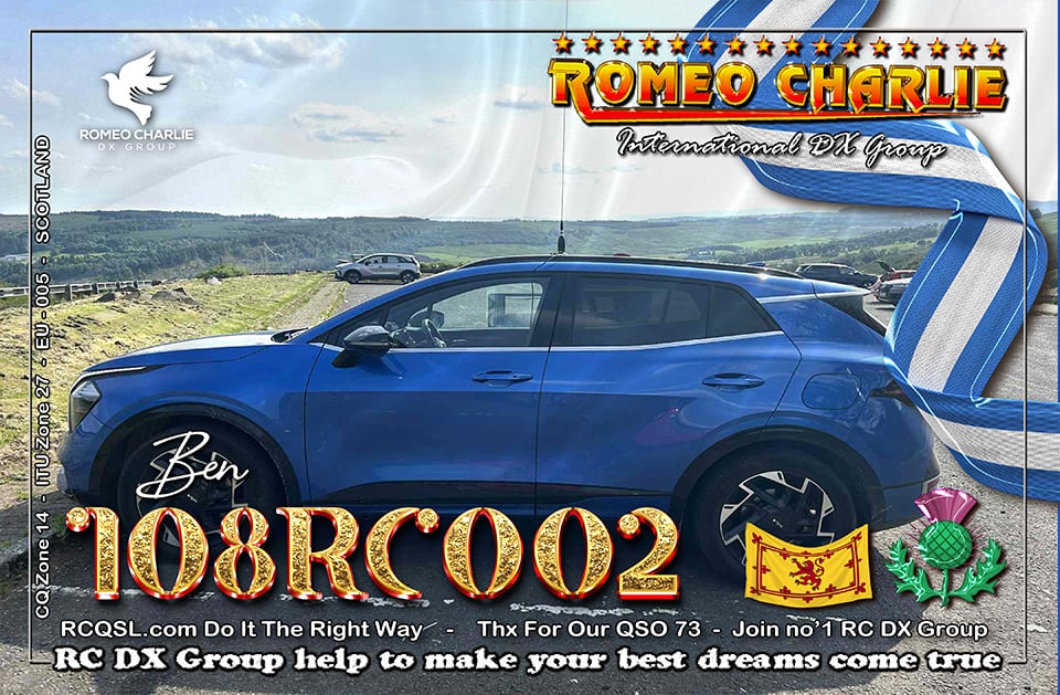 Hi im Ben 108RC002 Ex 108RC103 im 58 years old from Glasgow ive just joined the group on 27/05/2023 and look forward to making contact with other RC members around the world. My working conditions are FT891 with sirio 4000 megawatt for mobile. From home im using G5RV wire antenna inverted V . I was on the radio back in 79-80S and have just recently came back on air in the last 3 or 4 years. i hope to speak with you soon 73's 51's .From Glasgow Scotland. If By any chance you have not recieved my eqsl card please let me know via my email or on my 108RC002 facebook page i always send eqsl 100\\\\\\\\\\\\\\\\\% 108rc103@gmail.com