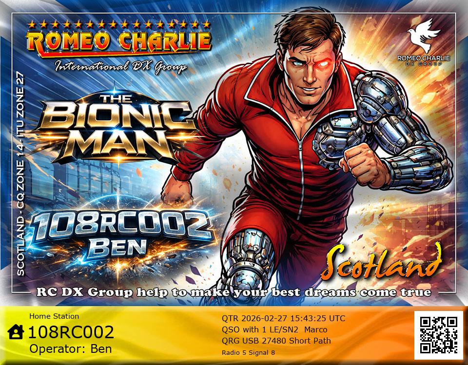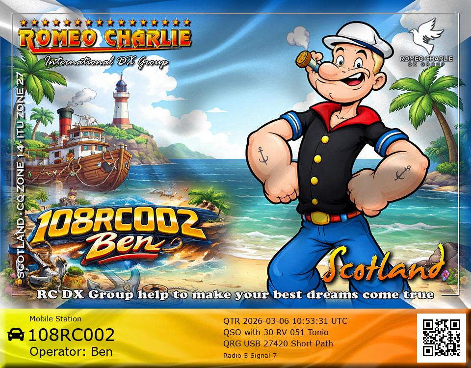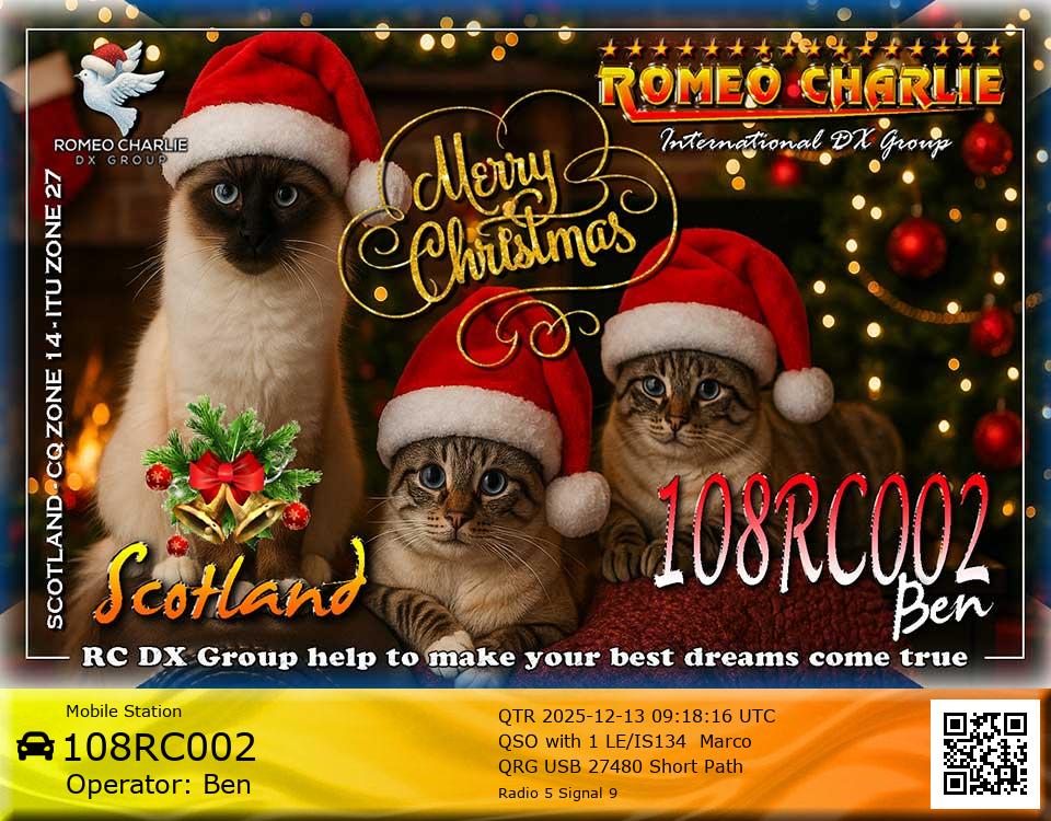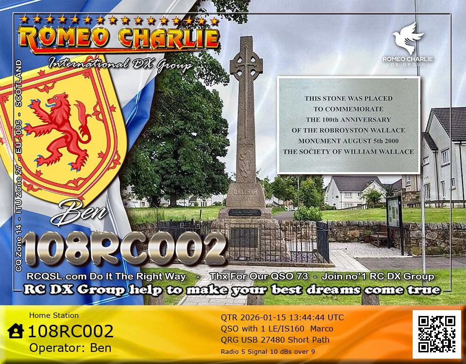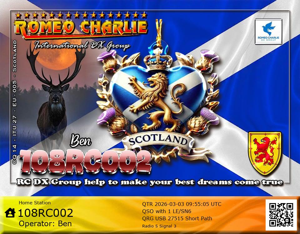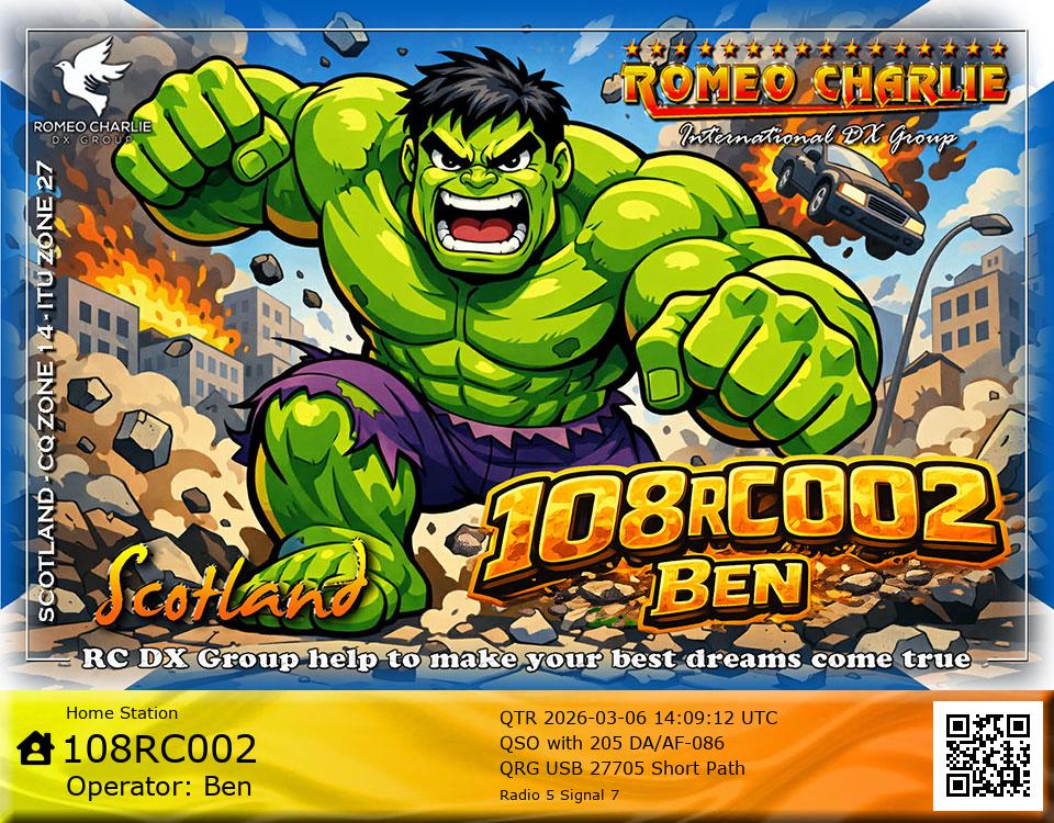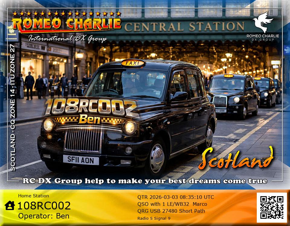 Hi im Ben 108RC002 Ex 108RC103 im 58 years old from Glasgow ive just joined the group on 27/05/2023 and look forward to making contact with other RC members around the world. My working conditions are FT891 with sirio 4000 megawatt for mobile. From home im using G5RV wire antenna inverted V . I was on the radio back in 79-80S and have just recently came back on air in the last 3 or 4 years. i hope to speak with you soon 73's 51's .From Glasgow Scotland. If By any chance you have not recieved my eqsl card please let me know via my email or on my 108RC002 facebook page i always send eqsl 100\\\\\\\\\\\\\\\\\% 108rc103@gmail.com